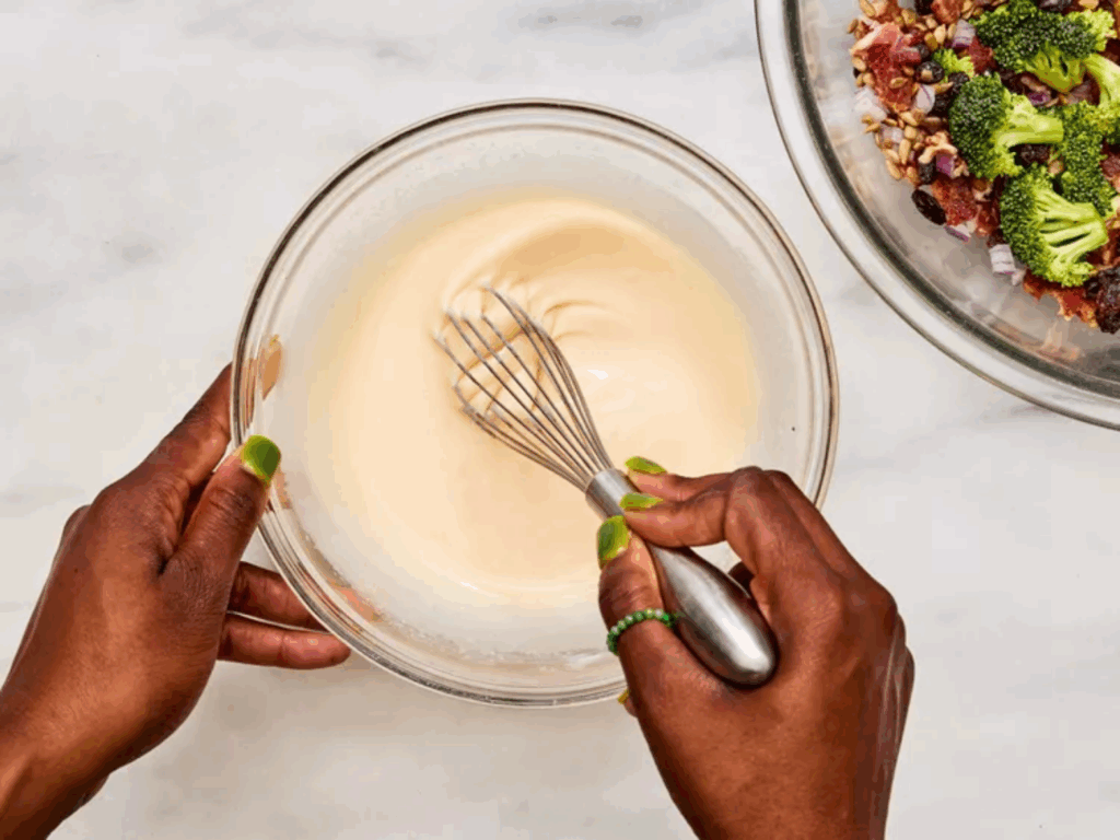 - Combine bacon, broccoli, raisins, onion, and sunflower seeds in a large bowl.